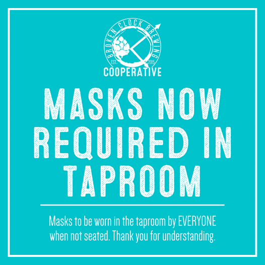 Starting today at open, masks are now required in the taproom whenever you are moving around, regardless of your vaccination status. We will also be removing bar seating for the time being to ensure that staff has limited contact with individuals without masks. If you forget your mask, we will have some available behind the…