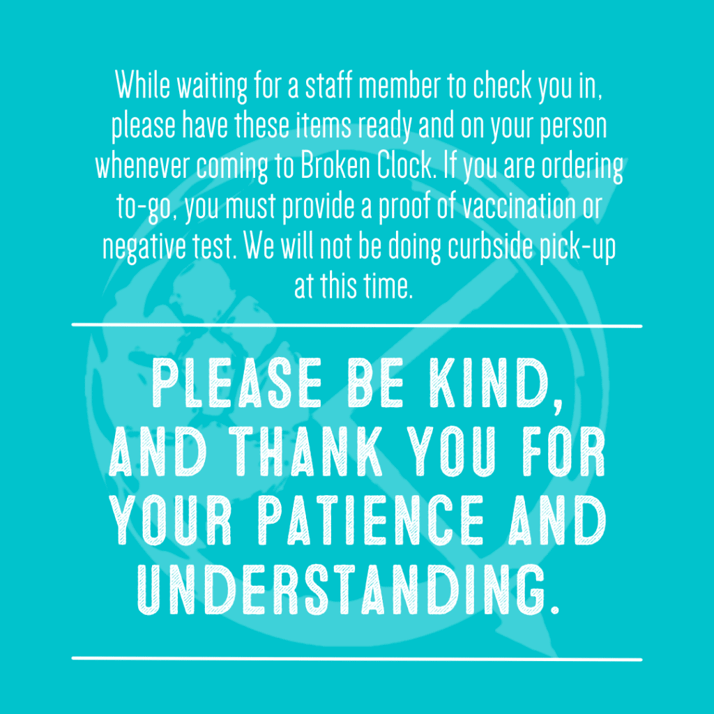 Starting Wednesday, January 19, Broken Clock Brewing Cooperative will be checking everyone ages 5+ entering into the taproom and domes for proof of COVID-19 vaccination or a COVID-19 negative PCR or antigen test. When you enter into the taproom at any entrance, there will be an area for you to wait for a staff member…